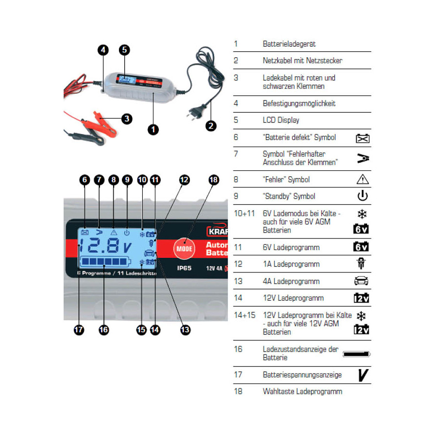 Este cargador de batería de 11 pasos es compatible con baterías de plomo-ácido de 6 V o 12 V, incluyendo baterías húmedas, MF, de gel o AGM. Seleccione el voltaje de carga (6 V o 12 V) y el cargador controlado por microprocesador cargará automáticamente la batería hasta el final del ciclo. Dispone de seis programas de carga. La carga de la batería es totalmente automática y se realiza en 11 pasos. La tecnología de seguridad moderna incluye protección contra polaridad inversa (conexión incorrecta), protección contra sobrecarga térmica y protección contra cortocircuitos para protegerle a usted y a su dispositivo del uso indebido. Un cable con abrazadera está firmemente fijado al cargador, resistente al agua y al polvo (clase de protección IP65).