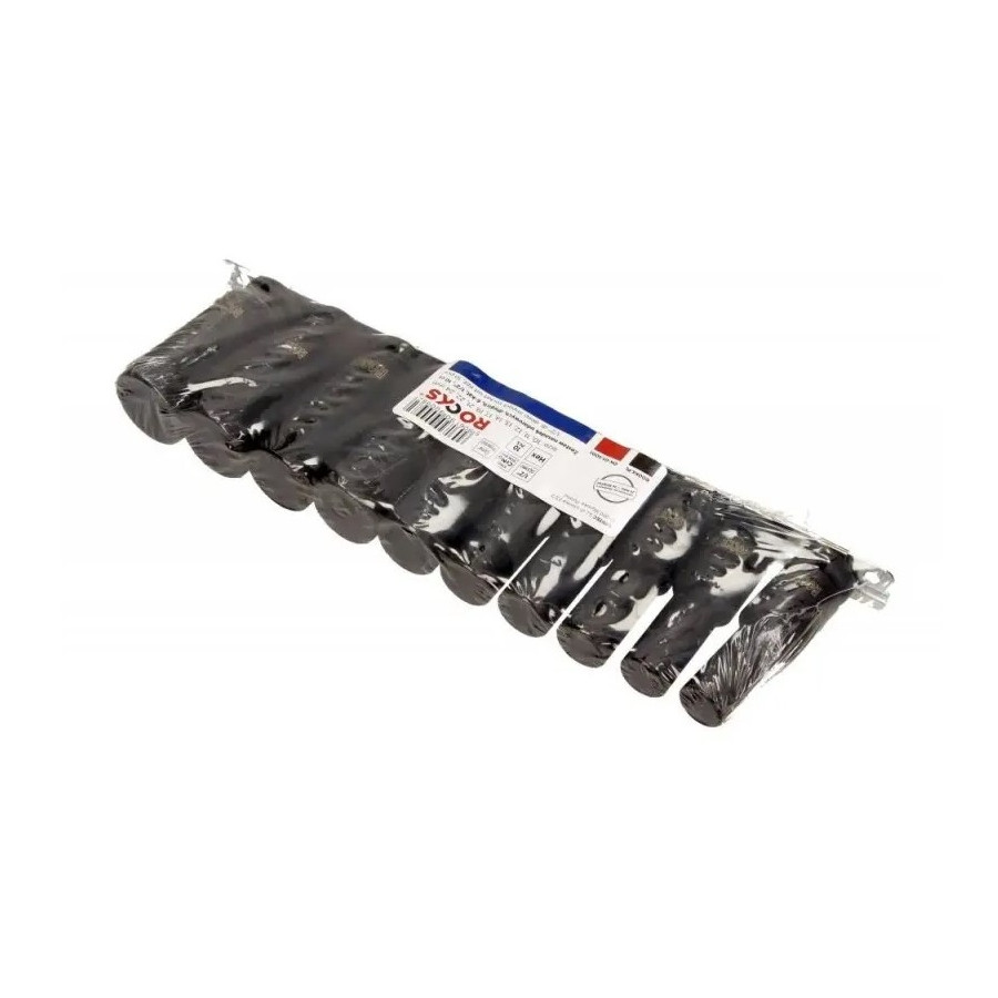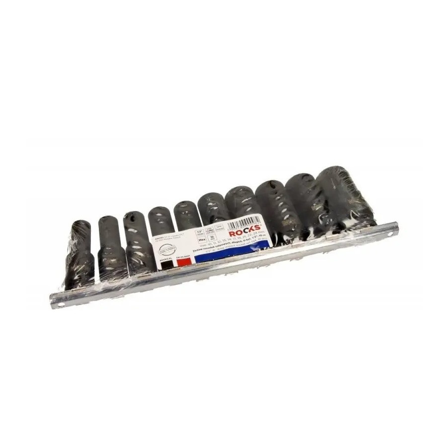 Juego de vasos de impacto de 1/2" de largo y 6 puntas. Contiene 10 vasos de impacto largos montados en una práctica tira metálica. Los vasos están fabricados en acero al cromo-molibdeno de alta calidad (CrMo SCM440) y diseñados para funcionar con llaves de impacto. Este juego de vasos de impacto largos está diseñado específicamente para talleres automotrices.