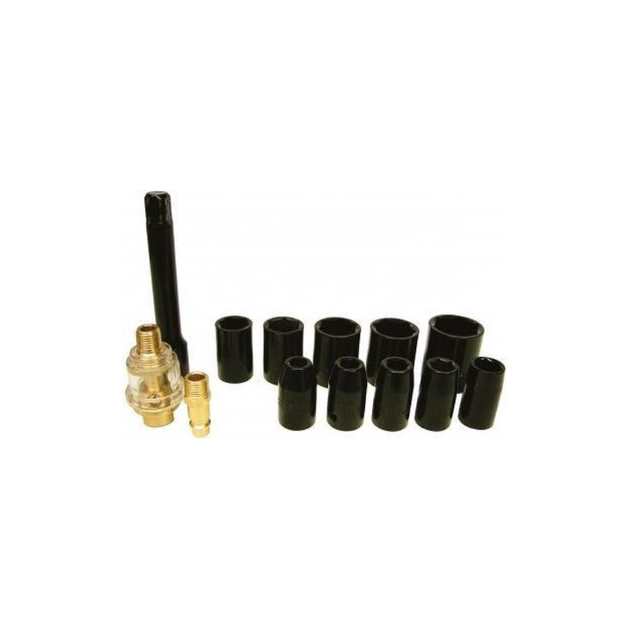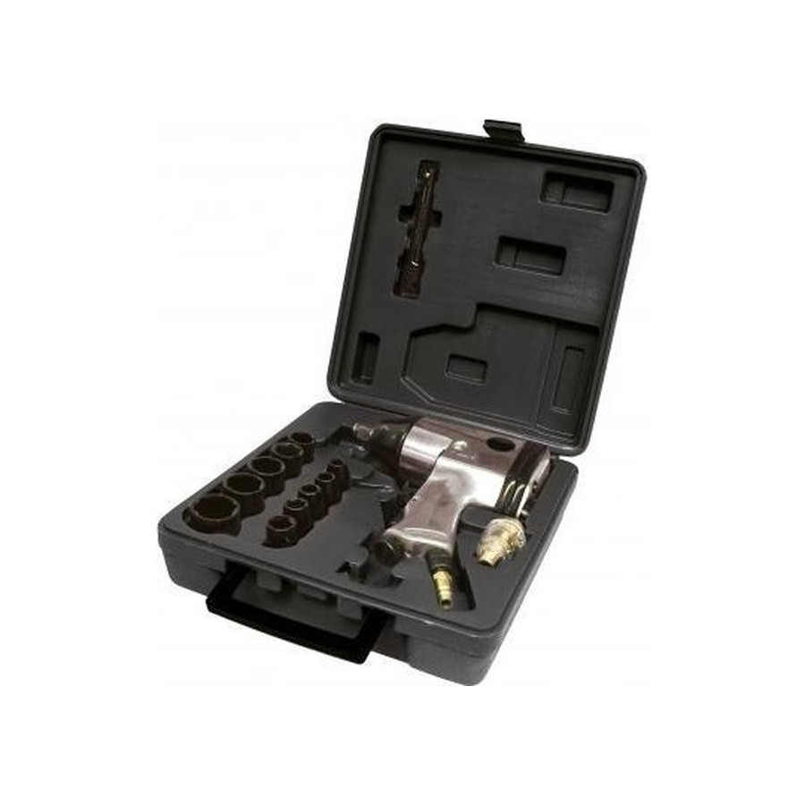 Este kit completo incluye todo lo necesario para empezar de inmediato. Con diez llaves de vaso, un depósito de aceite y una botella de aceite, puedes apretar o aflojar lo que necesites. Solo necesitas un compresor y una manguera.