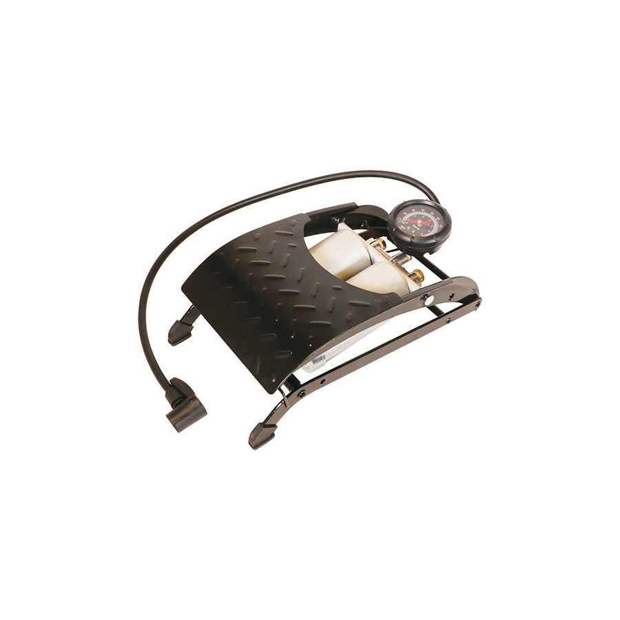 La bomba de pie Carpoint con doble cilindro y manómetro cuenta con una robusta construcción de acero y un pedal antideslizante. Gracias a los adaptadores incluidos, es apta para neumáticos de coche, juguetes inflables, neumáticos de bicicleta y balones.