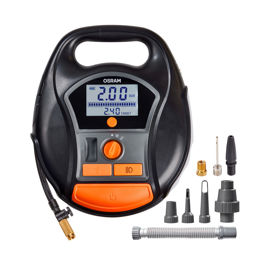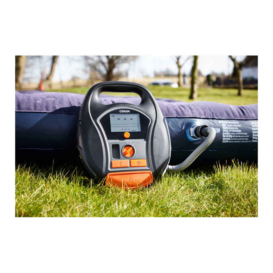 El OSRAM TYREinflate 6000 es un sistema de inflado de neumáticos inalámbrico y recargable con una batería de iones de litio, lo que lo convierte en el compañero ideal para acampar y realizar viajes por carretera.