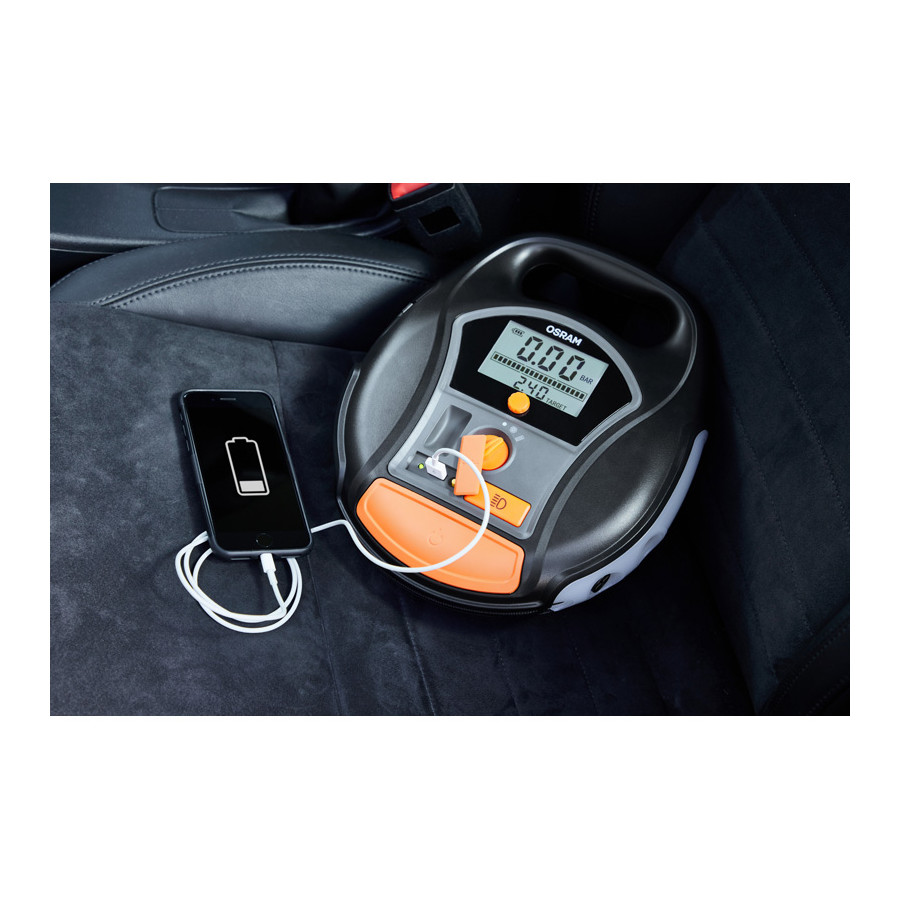 Gracias a su función de batería externa, el OSRAM TYREinflate 6000 también puede usarse como cargador para dispositivos electrónicos como el teléfono móvil. El paquete incluye un cargador de pared y un cable de 12 voltios para alimentación directa si es necesario. También incluye un juego de 10 adaptadores, una bolsa de almacenamiento y tapones de válvula de repuesto.
