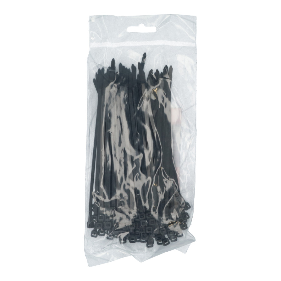 Las bridas son resistentes a los rayos UV, tienen una alta resistencia a la tracción y soportan temperaturas de -40 °C a +85 °C. Se suministran en paquetes de 100.
