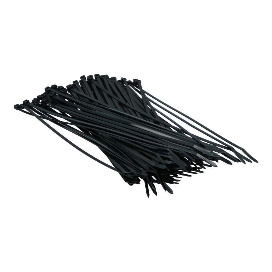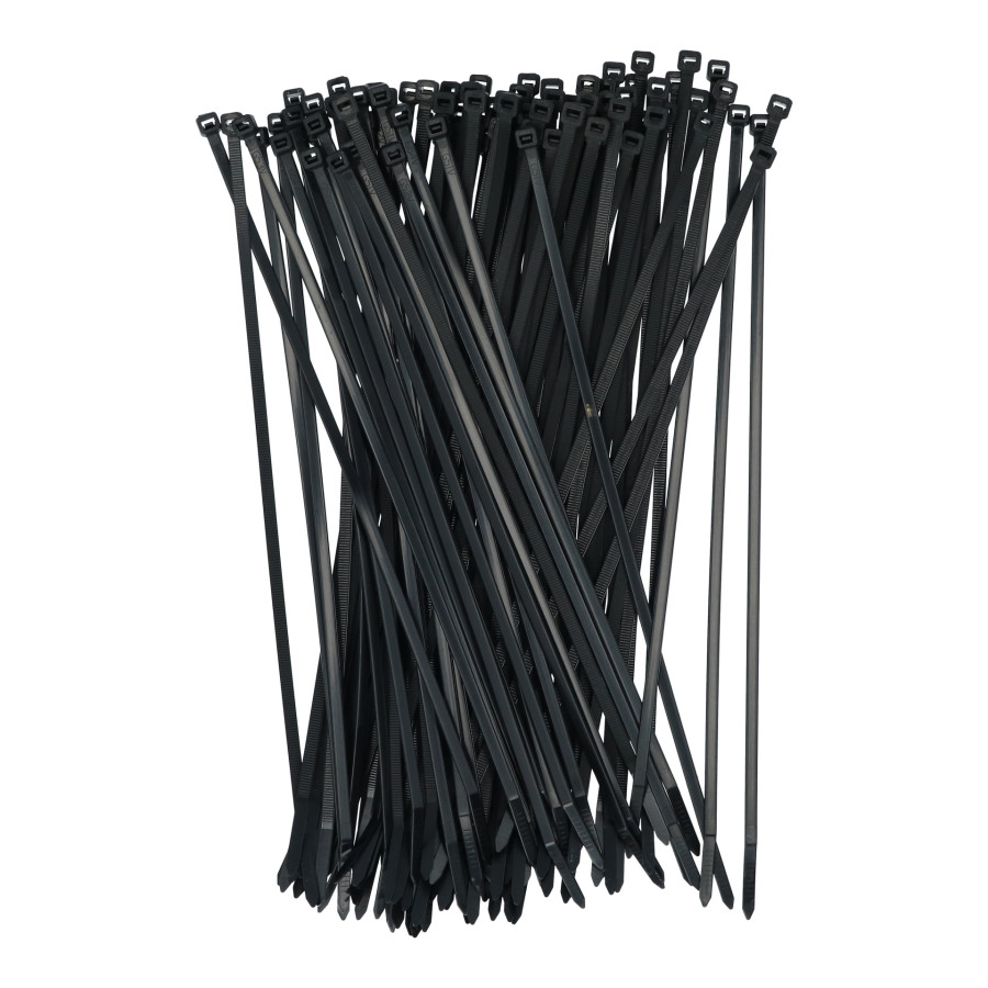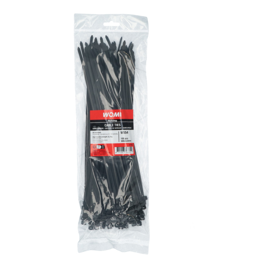 Bridas universales de plástico negro Womi W554, de 300 mm de largo y 4,8 mm de ancho. Cuentan con un cierre de plástico y una pestaña de bloqueo curvada para facilitar su inserción.