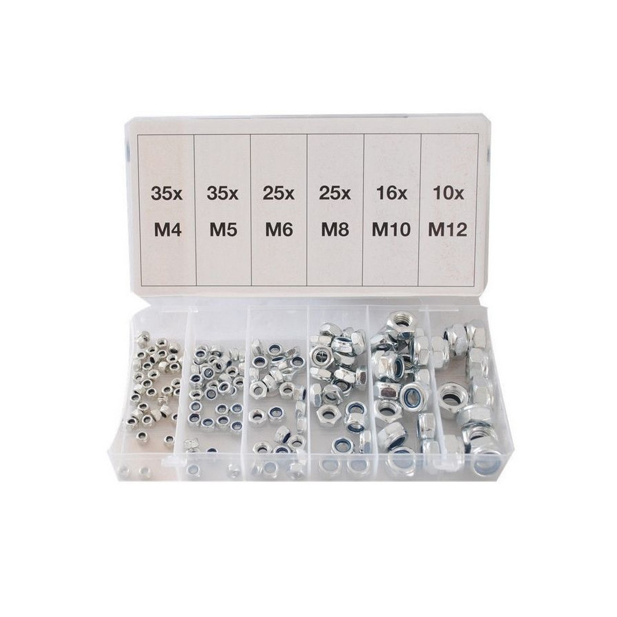 Surtido de 146 tuercas hexagonales galvanizadas con anillo de retención de nailon en 6 tamaños diferentes.