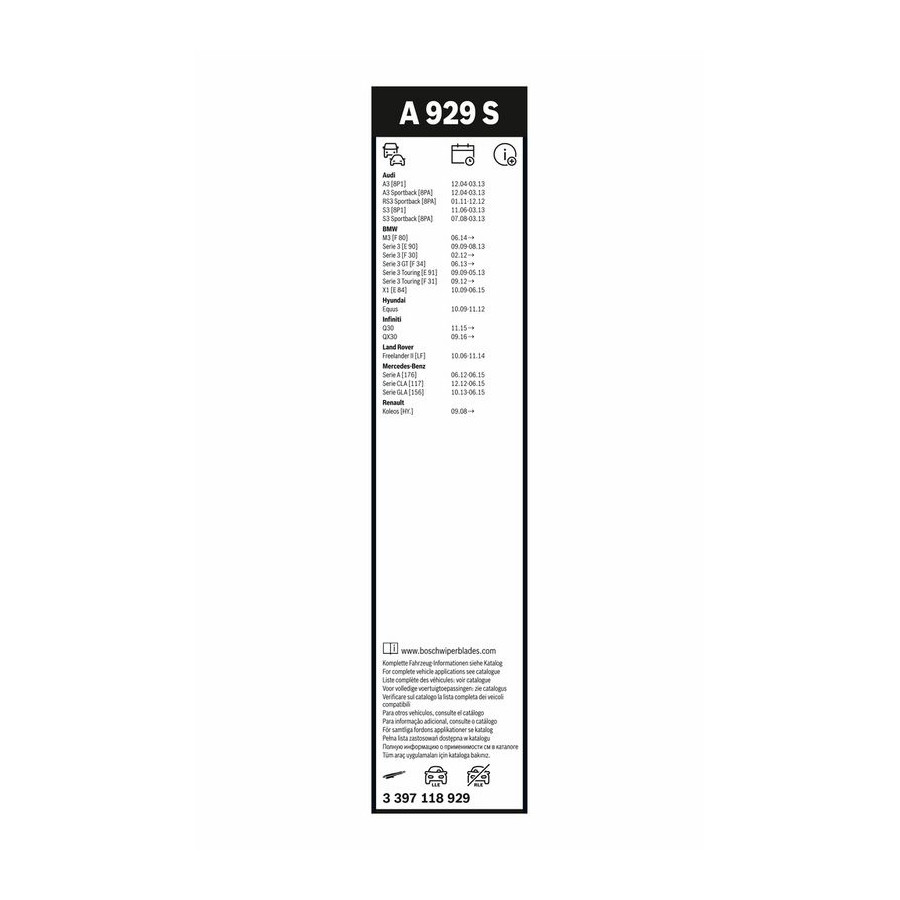 Après une recherche par plaque d'immatriculation, j'ai finalement choisi ce modèle. Un excellent choix jusqu'à présent. Essuie-glaces silencieux et efficaces, je le recommande vivement, tant les essuie-glaces Winparts que les Bosch A929s.